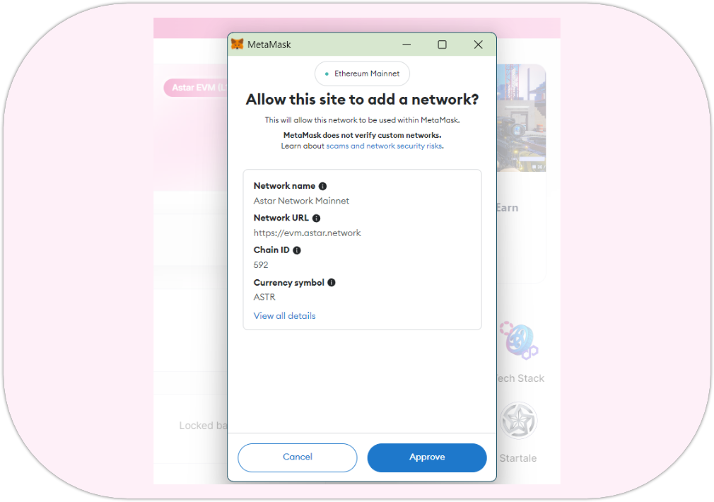 1. Metamask will pop-up and ask you if you would like to add Astar Network. Please check the info and approve.