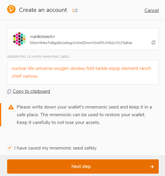 You should back up these words. Please, store the seed somewhere safe, secret, and secure. If you cannot access your account via Polkadot{.js} for some reason, you can re-enter your seed through the Add account menu by selecting Import account from pre-existing seed.