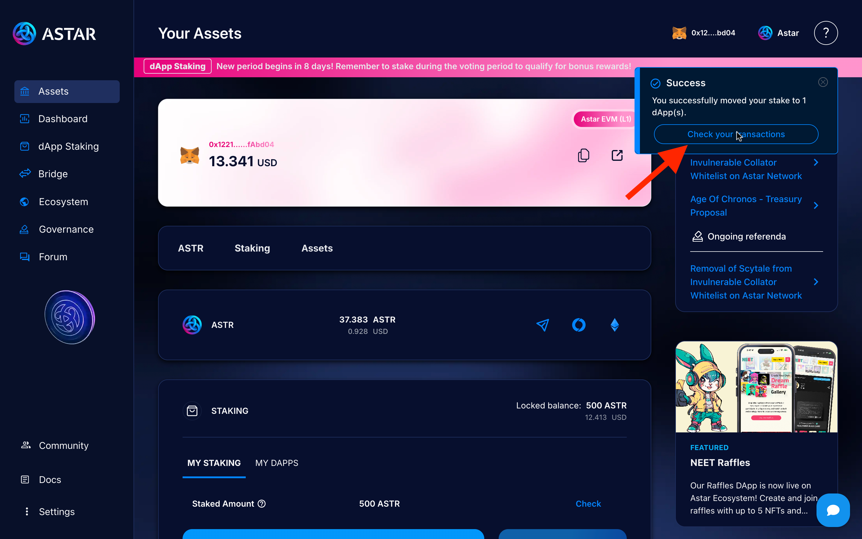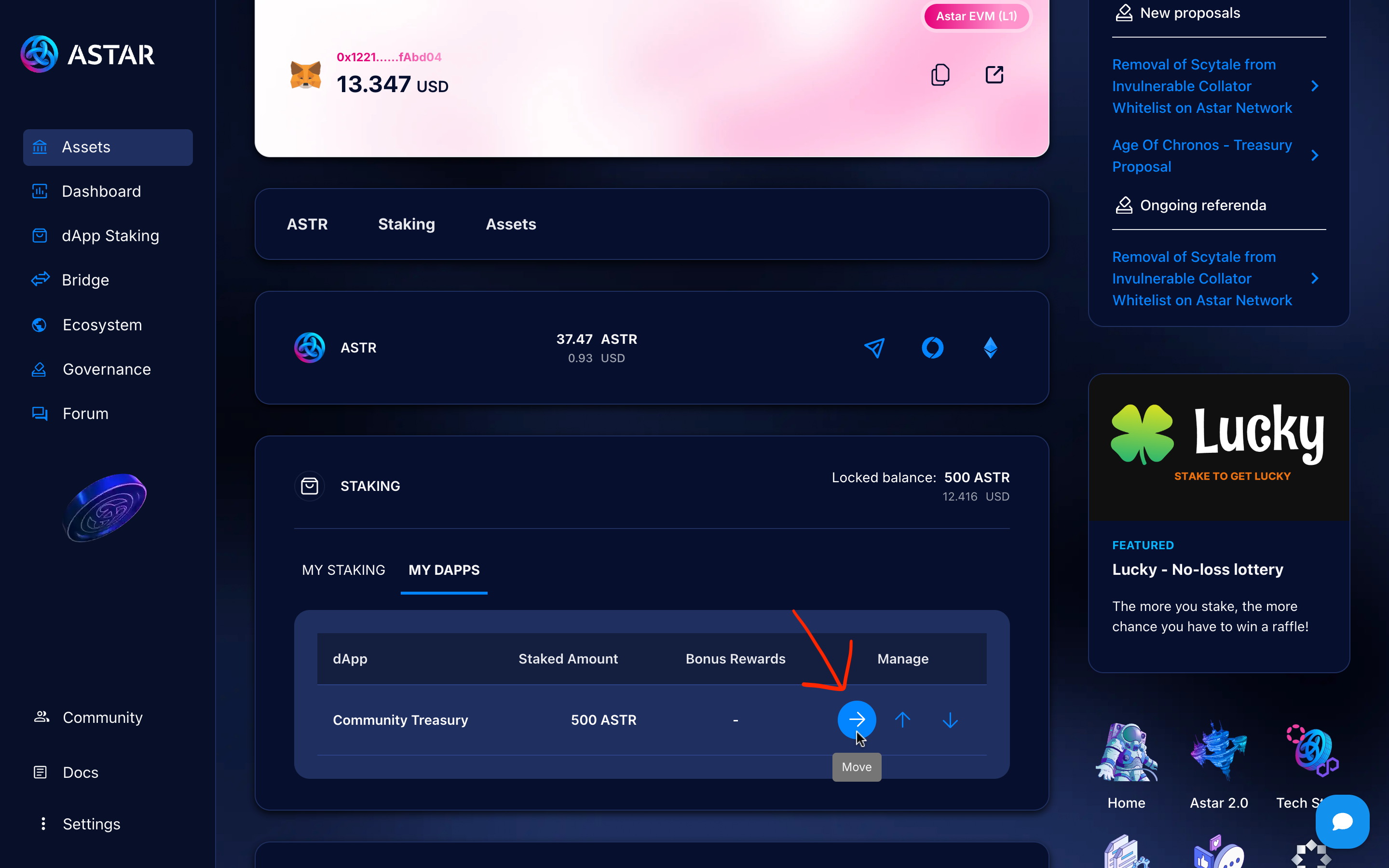 The Move function in Astar dApp Staking lets you transfer your already staked ASTR tokens from one dApp to another, without losing your bonus, as long as you stay within your allowed move limits.
